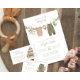 Dieses schicke Design besticht durch eine Wäscheleine mit bezaubernden Babykleidern, ein ausgestopftes Spielzeug und getrocknete Blume. Die neutrale Farbpalette von Salbei grün, beige und braun verleiht dem böhmischen Ambiente eine elegante und stilvolle Babydusche. Die Rückseite der Einladung zeigt die passende Aquarellkleidung und Accessoires, die das Aussehen ergänzen. Vollständig anpassbarer Text erlaubt es Ihnen, jedes Detail für Ihre besondere Veranstaltung zu personalisieren.
