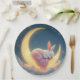 Ein flauschiges weißes Kaninchen ist gemütlich in einer rosa Decke eingewickelt und ruht sich friedlich auf einem glühenden Halbmond in einem traumhaften Nachthimmel aus. Kann für eine Mädchen-Dusche verwendet werden.