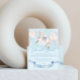 Horse-themed Dankeschön-Karte mit der Illustration eines hübschen, weißen Pony Baby und Watercolor Märchencolor golden Sternen mit pastellfarbenen Ballons und blauem Band zum Ende der Feier!