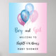 Ein Begrüßungspposter für eine Babydusche für Junge und Mädchen. . Ein blauer, weißer, rosa Farbverlauf. Blau-, Rosa- und Weißballons. Personalisieren Sie die Namen der Eltern und fügen Sie sie hinzu. Der Name und der Text: Junge oder Mädchen werden mit einem handgeschriebenen Stift geschrieben
