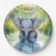 A sweet personalized first birthday paper plate with an elephant theme. A cute baby elephant looking at his reflection in the water.