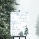 Baby, Es ist Cold Outside Willkommensschild Winter Wonderland Baby Dusche Willkommensschild mit blauen Schneeflocken und Kiefern.