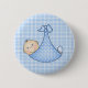 Ein hellblauer überprüfter Hintergrund mit einem Baby swaddled in einer blauen Decke auf kundengerechten Babyknöpfen und Magneten, vervollkommnen für Babypartys oder die Ankündigung der neuen Babyankunft.