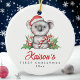 Baby Koala Erste Weihnachtsfeier Keramik Ornament — Die wertvoll personalisierte Weihnachtsschmuck-Vorlage des Babys mit einem bezaubernden Aquarellbären koala mit einer Weihnachtsmannmütze und einem Ferien Bonbons, sitzen auf Winterwald mit Beeren. Die Textfelder ermöglichen eine einfache Anpassung des Babynamens in einem handgeschriebenen, fett gedruckten Schriftart, und das Geburtsjahr in einer einfachen, minimalistischen Sans Serif. Beide Seiten dieser personalisierbaren Sake-Baum-Dekoration sind identisch.