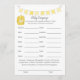 Ein lustiges Spiel für die Babydusche ist das Baby-Sprachspiel. Dieses Spiel hat ein gelbes Banner oben und ein Fass Honig. Auf der Rückseite ist ein Junge Teddy Bär, der auf einem Honigfass aufbaut und eine Honigbiene mit Vorlagen beobachtet.