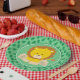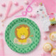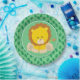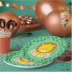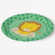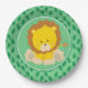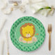 Diese Partyplatte kennzeichnet einen grünen Hintergrund mit einem wiederholenden Muster des Dschungel-Blätter. Ein niedliches Baby clipart brauner und orange Löwe sitzt in der Mitte der Platte.