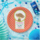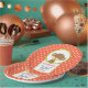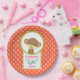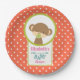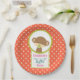 Teller mit Babydusche. Mit einem niedlichen kleinen Affen, der einen Schnuller in seinem Mund hält Innen einen Kreis mit einem Oliven-grünen Rand. Der Hintergrund ist ein orangefarbenes und weißes Polka-Punktmuster. Die Buchstaben des Wortes Baby hängen von einem Boho Stil Pfeil herab. Personalisieren Sie mit Ihrem Ehrengast.