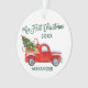 Modern Brush Skript Mein erstes Weihnachtsbaby First Christmas Ornament beinhaltet Watercolor Vintag Red Truck mit Weihnachtsbaum, Schnee, Weihnachtsgeschenke und Candy Canes. Grünes Skript.