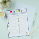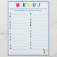 Das Design zeichnet sich durch einen hellblauen Hintergrund, einen hellblauen Rahmen und Text aus. Die Überschrift "HELP!" wird oben in hellen Farben angezeigt. Auf Wunsch können Sie die Richtung für eine personalisiertere Touch anpassen. Die Gäste werden gefragt, die Namen der weiblichen Babys anzugeben, beginnend mit dem angegebenen Buchstaben. Auch in Rosa/Rot erhältlich. Konzipiert zur Koordination mit der "ABC Baby Shower and Kinderzimmer Collection".