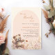 Wir können frühzeitig auf die Einladung von Baby Shower warten. Cremefarbener Hintergrund und pfirsichfarbener Bogen. Die Wildblumen sind in Beige, Rosa und Teddybär in Aquarellfarben gehalten. 1 Blatt = 1 Einladung mit Druckkante bis Kante.