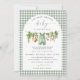 Une invitation au baby shower à thème locale qui présente un graphique en fil d'eau qui présente des vêtements pour bébés et une variété de légumes et de verdure. Il a un vert sage en vichy arrière - plan et est accentué d'une police moderne. Cette invitation élégante est facile à éditer et est parfaite pour un baby shower paysan neutre sur le thème du marché. Associez-vous à tout ce qui provient de la collection MILLIE pour un look cohésif.
