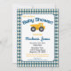 Cette amusante invitation à baby shower de construction bleu et jaune présente un camion à benne jaune avec arrière - plan à Jacquard plaid. Un joyeux garçon baby shower d'invitation pour le petit homme en construction.