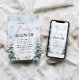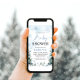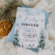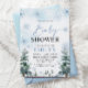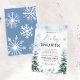 Winter Wonderland Baby shower invitation avec des flocons de neige bleus et des pins, et design boho.