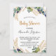 Pour un Baby shower. Un arrière - plan blanc chic. Décoré de verdure d'eucalyptus et de sprigs dorés, feuillage. Personnalisez et ajoutez un nom et des détails du parti. Lettres noires et dorées. Le texte : Baby shower et le nom de la mère à abeilles sont écrits avec un script de style manuscrit moderne. Retour : couleur arrière - plan verte