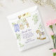 Baby shower Favor Bags présente de belles illustrations aquarelles de vêtements de bébé mignons accrochés sur une ligne à sécher, un mignon lapin farci, un adorable cheval à bascule et tous ces articles sont entourés de branches délicates avec des feuilles vert clair.