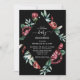Ce Baby shower floral élégant et foncé - présente un texte manuscrit blanc et élégant avec des roses bordeaux et rouge foncé chic et riche et une verdure luxuriante sur l'arrière - plan noir. L'envers de l'invitation est noir laconique. Faites votre mariage expressif et mémorable avec cette collection sombre et tendance.