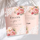 Un carte de remerciements de baby shower moderne et élégant. Un arrière - plan rose à gradient or. Décoré d'or rose et de roses roses rousses, fleurs florales et dentelle. Sur le devant le texte : Merci Retour : Modèle de Votre note de remerciement et nom.