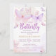 Un petit papillon est en route ! Invitation baby shower avec papillons roses et violets et éléments or.