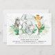 Invitation au baby shower-enfant à thème Safari avec zèbre, éléphant et girafe. Le dos de l'invitation a un motif tropical verdoyant.