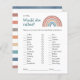 Herrliche Aquarellfarbe zeichnend durch Suki's eines boho Regenbogen in blau, aquamarin terra-cotta, beige grau und braun. Fröhlicher und lustiger Schriftart aquamarin für "Würden sie lieber Spieltitel und Kohle für zusätzliche Babydusche Details und Anleitungen. Die Rückseite des Babyduschspiels ist mit einem Aquarellstreifen in den gleichen Bohfarben wie der Regenbogen vorne ausgestattet. Design ist Teil der Boho Retro Baby Shower Party Supplies and Gifts Collection, die Einladungen für Babyduschen, Windelraffen und Bücherregale, Party, Dekoration und Geschenke für Neugeborene beinhaltet.