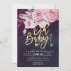 Baby Shower Einladungskarten Vorlagen - Elegantes Watercolor Natural Boho Blumenfeder und handgeschriebenes Gold Script auf Lila Sparkle Bokeh Licht Hintergrund. Alle Textstile, Farben, Größen können an Ihre Bedürfnisse angepasst werden.