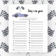 Race Car Thema Baby Dusche Einladungskarte mit Aquarellbildern eines lila (violetten) Vintage Autos und schwarz - weiß Rennen Flagge. "Renn um eine Babydusche."