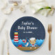 Auf dieser niedlichen und lustigen Platte befindet sich ein Seemann-Junge-Affe auf einem Holzdeck mit einer Möwe und einer Krabbe. Im Hintergrund befindet sich ein roter und weißer Leuchtturm, ein niedlicher Vogel auf einem Segelboot, Meereswellen und ein marineblauer Sternenhimmel. Der Text verbindet fett- und serifenlose Schriftart für ein stilvolles und modernes Aussehen. Das ist ideal für eine Babydusche zum Thema Wassersport.