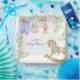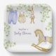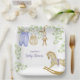Die Babydusche Papierplatte zeigt wunderschöne Aquarellbilder von niedlichen Babykleidern, die an einer Wäscheleine hängen, ein niedliches gestopftes Hasen, ein hübsches Rockpferd am Ende der Karte, und all diese Gegenstände sind von zarten Ästen mit hellgrünen Blätter umgeben.