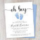 Niedliche, preisgünstige Babydusche mit E-Mail-Einladung mit "oh boy" in einem stilvollen Drehbuch mit Wimpern und einer pastellblauen Wasserfarbe von Babyfüßen. Unterhalb des Hotels können Sie die Dusche bequem per Post personalisieren.
