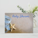 Fügen Sie Ihren eigenen Text für Informationen über die Babydusche hinzu. Blaues Band und winzige Seesterne für ein Babyevent.