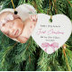Dieses wunderschöne Baby's erstes Weihnachtsgeschenk-Ornament mit hübschen Schriftzeichen und einem einfachen und modernen Design. Ein süß rosa illustrierter Bogen sitzt auf dem Boden des herzförmigen Ornaments. Personalisierter Name des Babys, erste Weihnachtsschrift, Geburtsdaten und Geburtstag sind auf der Vorderseite des Ornaments leicht personalisiert. Der Rücken ist ein volles Foto des neugeborenen Mädchens. Dieses elegante Ornament ist ein wunderschönes Geschenk für eine junge Mutter oder erwartete Eltern und kann auch ein nachdenkliches Geschenk von den Eltern an Freunde und Familie als Ankündigung der Geburt Ihres Kindes sein.