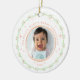 Célébrez le premier Noël de votre bébé ou offrez-en un cadeau aux nouveaux parents avec ce joli ornement de Noël en céramique. L'avant et l'arrière offrent un espace pour ajouter différentes photos, entourées d'une bordure circulaire en cuivre peachy, d'une délicate couronne verte et rose et d'une couronne de petites étoiles roses. Personnalisez encore plus avec le nom du bébé et "premier Noël" en haut et l'année en dessous de la photo. Cliquez sur le bouton Personnaliser pour customiser votre texte et vos photos dans les modèles fournis. Un cadeau de conservation qui fournira des souvenirs de famille pour une vie entière.