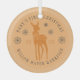 Modern baby dusty orange ornament for baby's first Christmas personalize with baby's name, year, deer with a bow, snowflakes and curve lettering in serif font.