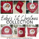 This festive Baby Boy's First Christmas Photo mug is decorated with the word JOY on a maroon-red background.