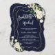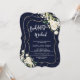 Elegantes Kartendesign mit feinen, weißen Blume und grünen Blätter, vergoldetem Rahmen für Imitate, Konfetti, moderner Handschrift "BACHELOERETTE WEEKEND" und "DETAILS" auf dunkelblauem Hintergrund. Verwenden Sie das Tool Personalize, um Ihre Informationen hinzuzufügen, Schriftart zu ändern, die Farben des Schriftartes zu ändern. Mehr Ideen in meiner Junggeselinnen-Abschied Collection.