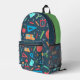 Dieses Design zeichnet sich durch niedliche Karikaturenfiguren von Schulobjekten auf blauem Hintergrund aus, die sich perfekt für den Rücken in die Schule eignen. Die Vorlage enthält eine Tasche für die Personalisierung.