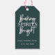 Baking Spirits Bright weiße Typografie zitieren festliche grüne Feiertage Geschenkmarken. Auf der Rückseite des Tags befindet sich ein weißes Spritzer-Muster, das dem grünen Hintergrund entspricht.