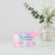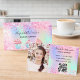 Ein rosa, lila, minzgrüner holografischer Hintergrund. Die Einrichtung ist mit rosafarbenen Imitaten aus Glitzer und Kuchen geschmückt. Personalisieren und fügen Sie Ihren Namen und Text auf der Vorderseite. Zurück: Vorlagen für Ihr Profil Foto, Name, Titel, Telefonnummer, E-Mail- und Website-Adresse, Ihren eigenen QR-Code für Ihre Website oder Ihr Social-Media-Konto.