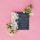 Ein wunderschönes Bouquet aus rosafarbenen Peonies vor mariniertem Hintergrund schafft einen hervorragenden Kontrast zu dieser Hochzeitseinladung. Finden Sie passende Produkte in meinem Geschäft, um diese Einladung zu erfüllen, z. B. Save the Date, UAWG, etc.