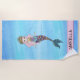Dieses personalisierte Badetuch hat eine Meerjungfrau mit Imitat funkelte der Schwanz, der eine Krone trägt, sie ist Set auf Schatten von blauem Ozean wie Hintergrund. Personifizieren Sie mit einem Namen auf der Unterseite.