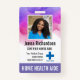 Personnalisez ces badges verticaux du personnel médical avec une photo et un nom d'employé, ainsi que plusieurs champs de texte personnalisés pour le titre ou le rôle, le nom de l'hôpital ou de l'établissement de soins de santé, le numéro d'identification de l'employé, ou valide jusqu'à la date. "HOME HEALTH AIDE" ou le texte souhaité apparaît en bas de la page en gras en lettres blanches pour faciliter l'identification lors de la visite des patients à la maison. Customisez avec un code à barres sur le dos si nécessaire, avec des informations de retour ou d'autres détails.