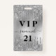 Un badge moderne, élégant et glamour pour une fête d'anniversaire de 21e (ou tout âge). Un arrière - plan à l'aspect métallique faux argent avec parties scintillant faux argent goutte à goutte, la peinture goutte à goutte. Personnalisez et ajoutez un nom. Le nom est écrit avec un script de style moderne écrit à la main avec des swashes. Le texte : VIP Numéro 21 est écrit en noir. Pour que les swashes ne suppriment que le nom de l'échantillon, laissez les espaces ou émoticônes devant et après le nom. Retour : détails de votre fête.