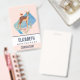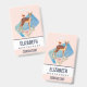 Nom badge avec un joli cerf brun avec un dos tacheté blanc. Un petit oiseau assis sur le dos du cerf. Un joli bouquet floral avec des roses aquarelles et des feuilles vert olive clair sous les pieds du cerf. Un rectangle bleu aquarelle derrière l'image. Arrière - plan coloré à la pêche.