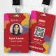 This modern visitor pass features a vibrant red background adorned with abstract colorful blobs, creating a dynamic and eye-catching design. It includes a prominent QR code for easy access or information retrieval, along with dedicated fields for 'Validity' dates and 'Contact Us' details. A space for 'Department Here' allows for easy identification within an organization. This design is perfect for businesses seeking a stylish and functional way to manage visitor access and information, ensuring a professional impression from the moment they arrive.