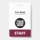 Personnalisez facilement ce badge de nom professionnel personnalisé sans photo, avec Scan Qr Code et logo d'entreprise. Un design d'entreprise simple, chaud et chaud marsala cerise vin rouge et blanc couleurs entièrement personnalisable en tailles avant et arrière, sans-serif polices de base et moderne et un look professionnel et clair, parfait pour les employés de petite entreprise, patron, invités. Ces fournitures de badges d'identification d'entreprise sont disponibles avec cordon, clip métallique ou avec rétractable. Pas de commande minimum, mais économiser de l'argent et profiter de rabais Zazzle par plusieurs commandes!