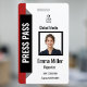 badge professionnel de presse rouge et noir avec espace pour votre photo, nom, titre, logo de l'entreprise, et code à barres. Parfait pour les médias, les journalistes, les photographes, le personnel événementiel et les laissez-passer de presse d'entreprise. Un modèle personnalisable pour les nouvelles, les équipes de production et les événements spéciaux.