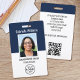 Créez une apparence professionnelle avec ce badge d'identification d'entreprise personnalisé. Un modèle simple et élégant avec votre logo, photo d'identité, nom, titre de poste et nom de l'entreprise. Tout le texte peut être customisé, de sorte que vous pouvez inclure les informations que vous voulez. Les coordonnées figurent au verso, ainsi que des informations supplémentaires et un code QR. Couleurs : bleu marine très foncé, gris et blanc. Format vertical.