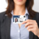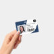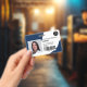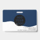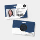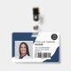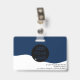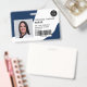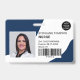 Un badge d'identification photo marine moderne et professionnel éditable, avec logo et code-barres horizontales.
