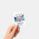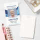 Bleu, bleu marine et blanc badge d'identification d'employé avec des formes dans trois nuances de bleu. Le badge d'identification de l'employé est personnalisé avec le nom, le titre, le numéro d'identification et un code à barres au dos.