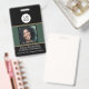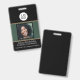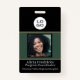 Ce badge personnalisé d'identification d'employé présente un design noir et vert sophistiqué. Un exemple de logo d'entreprise ou d'entreprise est placé en haut, que vous pouvez personnaliser pour inclure votre propre logo ou image personnalisée. Une photo du personnel est imprimée au centre sur un arrière - plan vert de pinède. Le nom de l'employé, du poste et du lieu d'emploi est imprimé en bas.